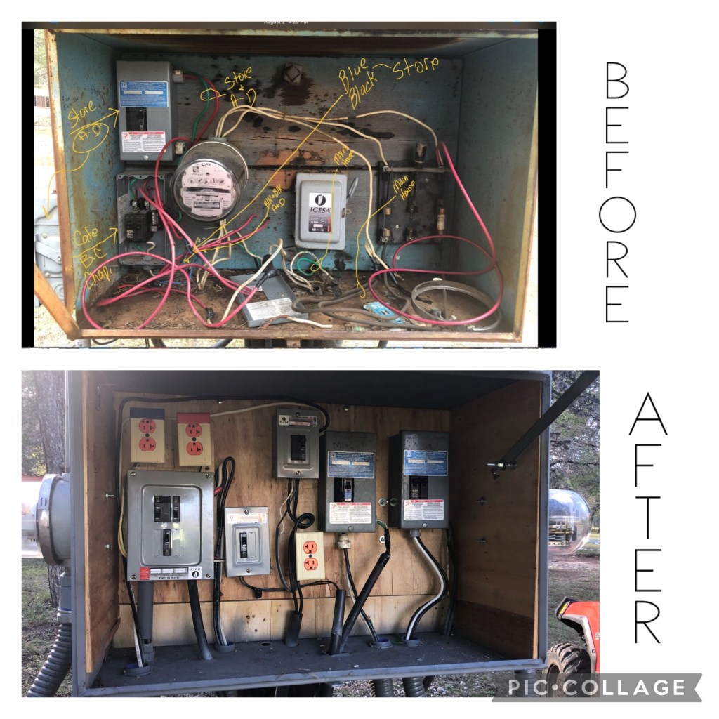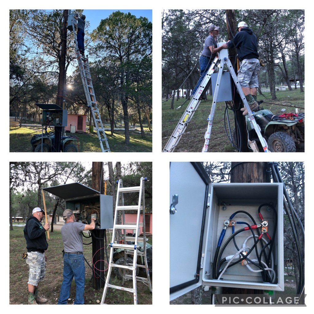 Marty and Mike successfully rewired the main transformer for the camp and installed proper breaker boxes and disconnect switches.